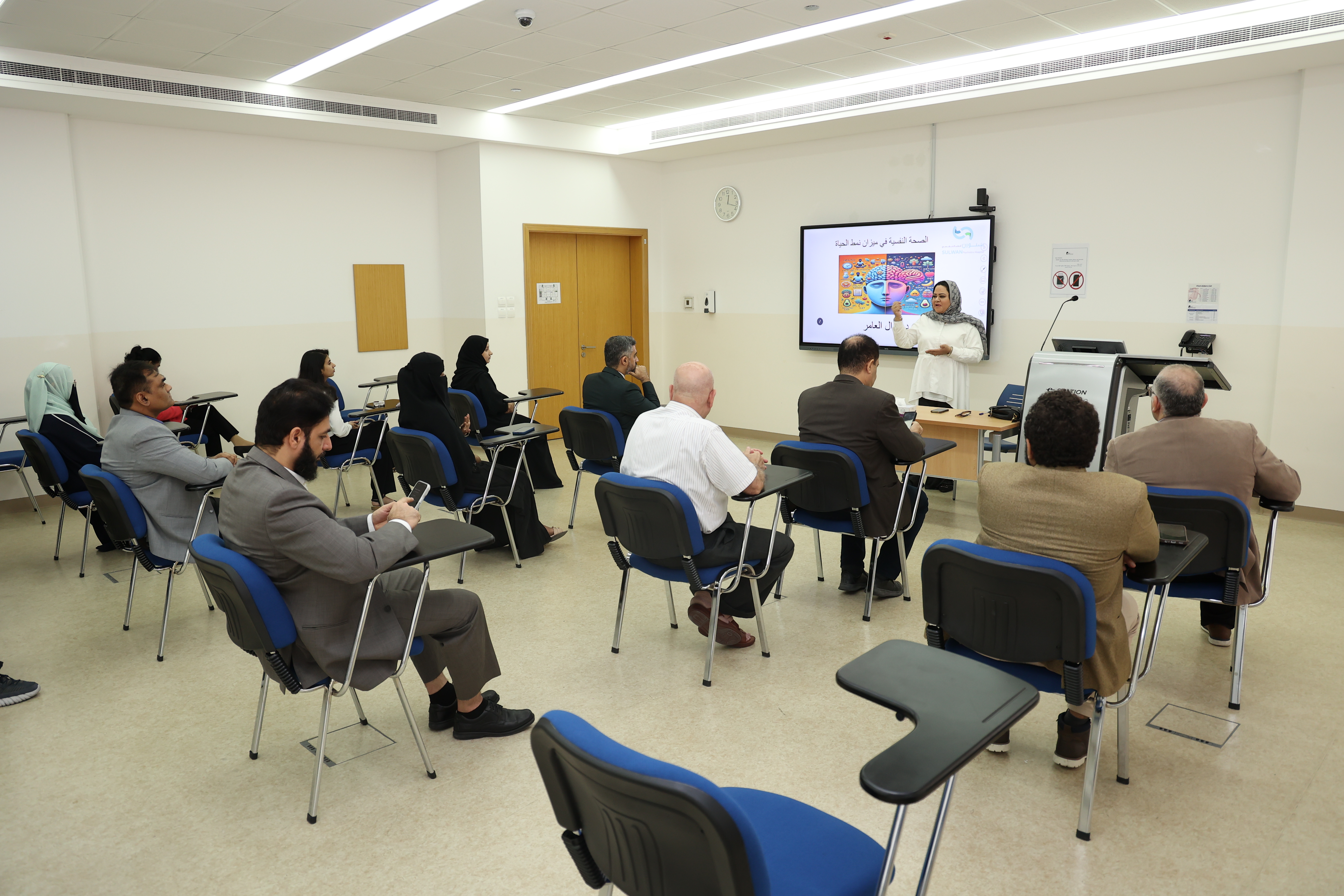 The lecture was delivered by Clinical Psychologist Ms. Nawal Al Amer, with the attendance of a group of university staff. Ms. Al Amer addressed several key topics aimed at helping participants understand effective ways to manage stress in professional environments while providing practical tools to strengthen their psychological resilience and enhance personal and workplace well-being.